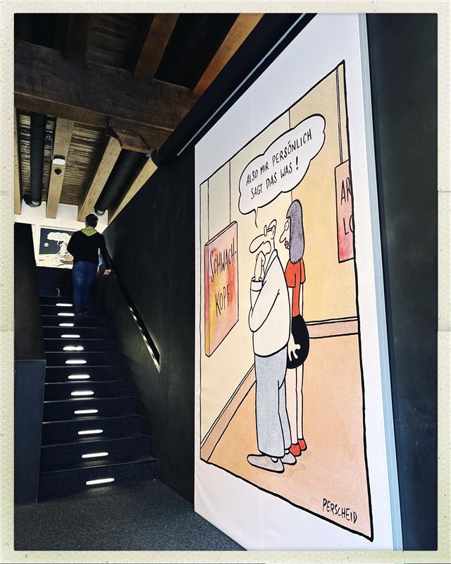 Im Mittelpunkt des Besuchs stand die Einzelausstellung des bekannten Cartoonisten Martin Perscheid. Seine Zeichnungen, bekannt unter dem Titel „Perscheids Abgründe“, boten den Schülerinnen und Schülern einen direkten Zugang zu schwarzem Humor und gesellschaftskritischer Komik. Anhand der markanten Figuren mit Knollennasen diskutierten die Kurse über die Wirkung von Pointen und die Grenzen des Humors.