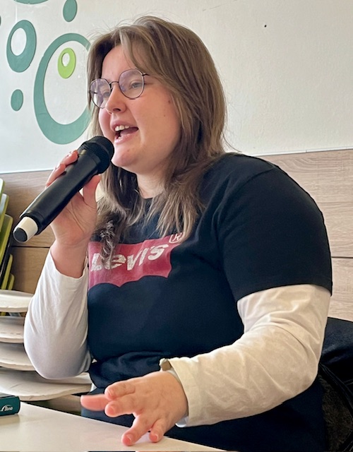 Silke Scriba von der OVAG machte den Jugendlichen der Schrenzerschule Mut, doch auch mal einen Text beim Wettbewerb einzureichen, erzählte von den attraktiven Preisgeldern und den damit verbundenen Workshops mit Autoren, bei denen man viel lernen kann.