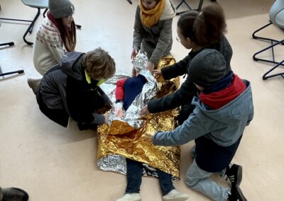Der Schul-Sanitätsdienst berichtete über seine Aufgaben und lud ein, ein Fingerkuppen-Pflaster zu kreieren und richtig zu kleben. Auch an einem Dummy wurde geübt, zum Beispiel eine verletzte Person in eine Rettungsdecke zu packen.